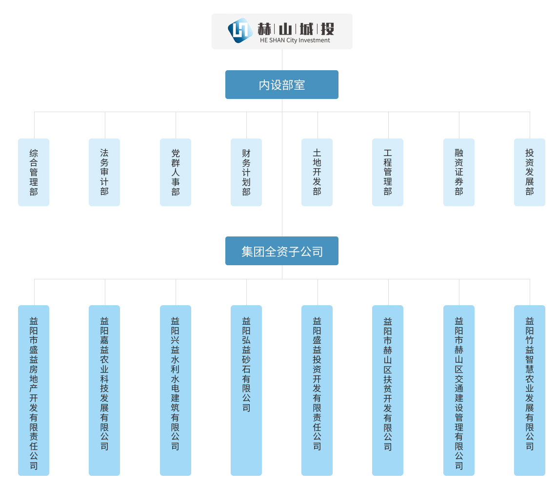 益陽市赫山區(qū)城鎮(zhèn)建設(shè)投資開發(fā)(集團)有限責(zé)任公司實行董事會領(lǐng)導(dǎo)下的總經(jīng)理負責(zé)制,下設(shè)8個內(nèi)設(shè)部室和8個全資子公司